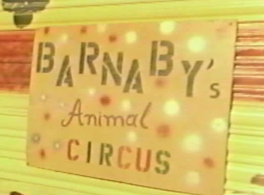 I then found a closeup of the family dog barking at something in the distance -- a shot taken from the "Hollywood Safari" movie, filmed several years earlier in 35mm (the series was shot in 16mm). Next, I borrowed a shot from Uncle Barnaby's introductory scene earlier in the episode -- a closeup of the trailer featuring the "Barnaby's Animal Circus"sign, seen above -- slowed it down and reversed it, and used it as Peter's P.O.V.